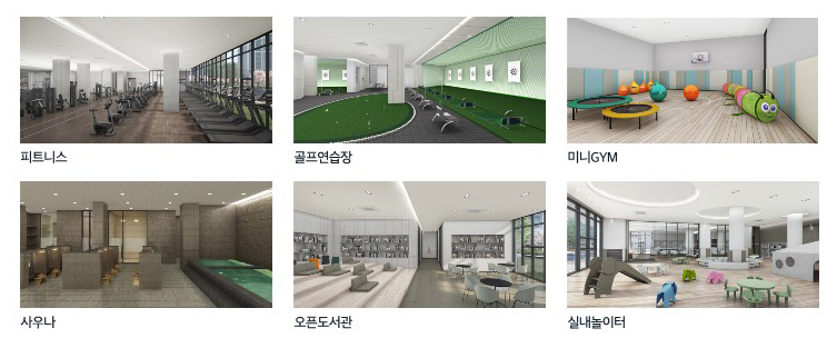 이에는 피트니스 헬스장, 골프 연습장, 미니GIM, 사우나와 같은 시설이 포함되어 있습니다. 또한 오픈도서관과 실내 놀이터 등을 통해 가족 구성원들의 만족도를 높이고 있습니다.