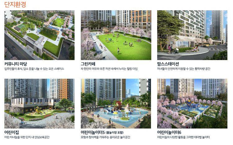 아파트 단지 안에는 중앙광장, 생태연못, 어린이놀이터 등 다양한 테마정원이 조성되어 있습니다. 또한 남동향과 남서향을 주로 고려한 설계로, 상쾌한 주거 환경을 제공하고 있습니다.