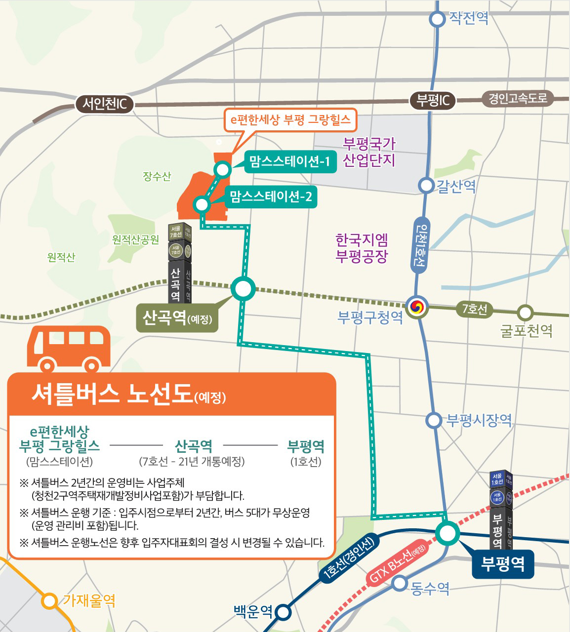 입주 후 2년간 단지에서 산곡역과 부평역으로 운행하는 전용 셔틀 버스를 무료로 제공하여 교통에 불편함이 없도록 돕고 있습니다.