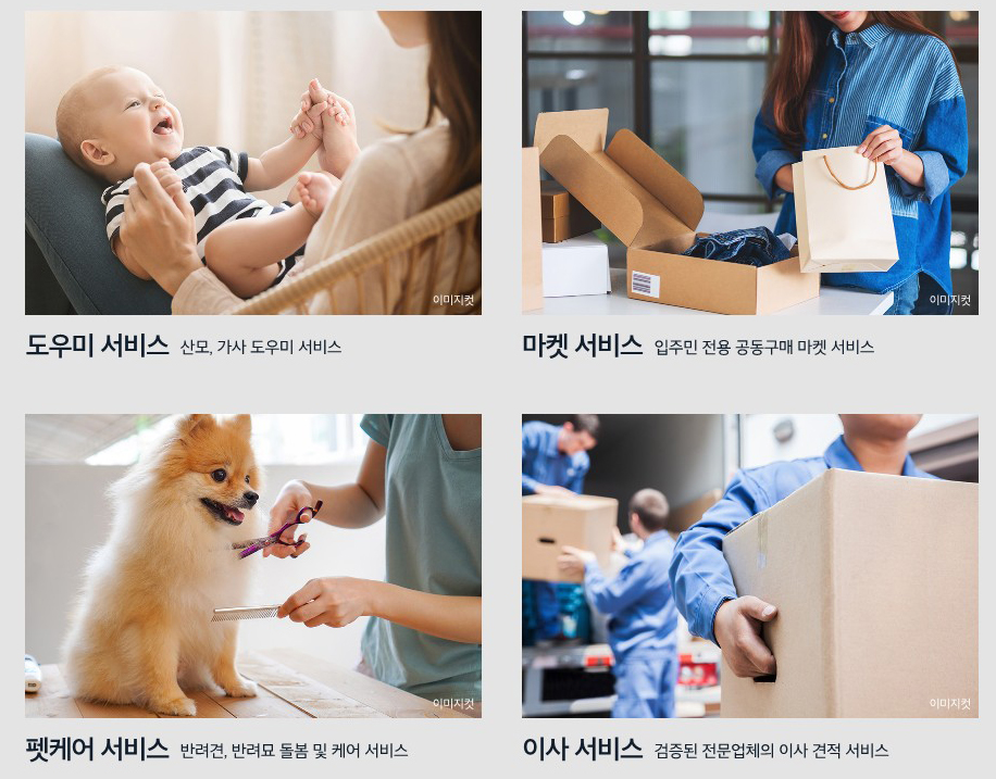 산모 서비스, 가사도우미 서비스, 공동구매 마켓 서비스, 반려동물 돌봄 및 케어 서비스, 전문업체의 이사 견적 서비스를 통해 입주민들의 생활을 더욱 편리하게 만들어줍니다.